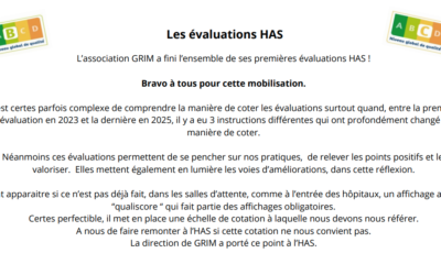 L’association GRIM a fini l’ensemble de ses premières évaluations HAS !Bravo à tous pour cette mobilisation.Il est certes parfois complexe de comprendre la manière de coter les évaluations surtout quand, entre la premièreévaluation en 2023 et la dernière en 2025, il y a eu 3 instructions différentes qui ont profondément changé lamanière de coter.Néanmoins ces […]